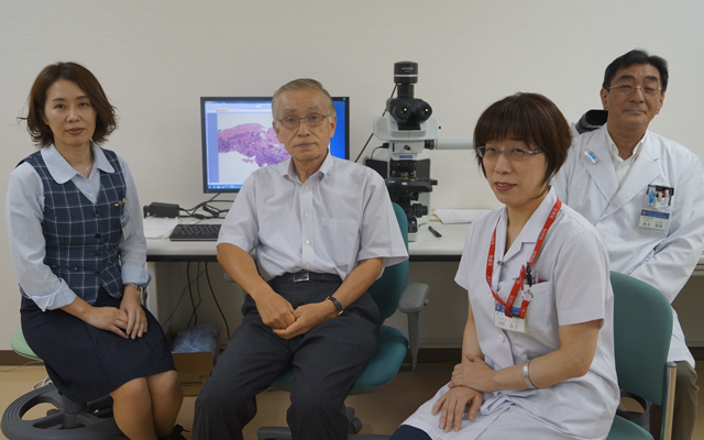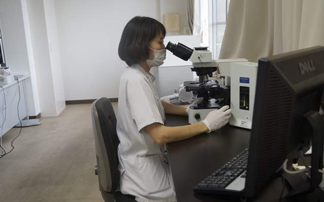当検査室では、常勤病理医1名、臨床検査技師7名にて組織診断等を実施しています。ほぼすべての検査を院内で実施していますが、遺伝子検査等は外注に委託しています。